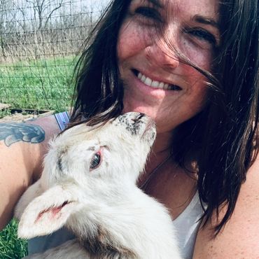 My sweet little one horned goat was skin and bones when she arrived. She was said to be pregnant but because of her lack of nourishment, she lost her pregnancy. She is an absolute doll and loves to eat and go for walks on a leash. She is the first to greet me in the morning and the first to want snuggles. This quirky goat has added so much joy to the gang and has bonded with the sheep and literally thinks she's a puppy dog. Her favorite pastime is to sneak in the back door and clomp clomp into the kitchen for a snack.